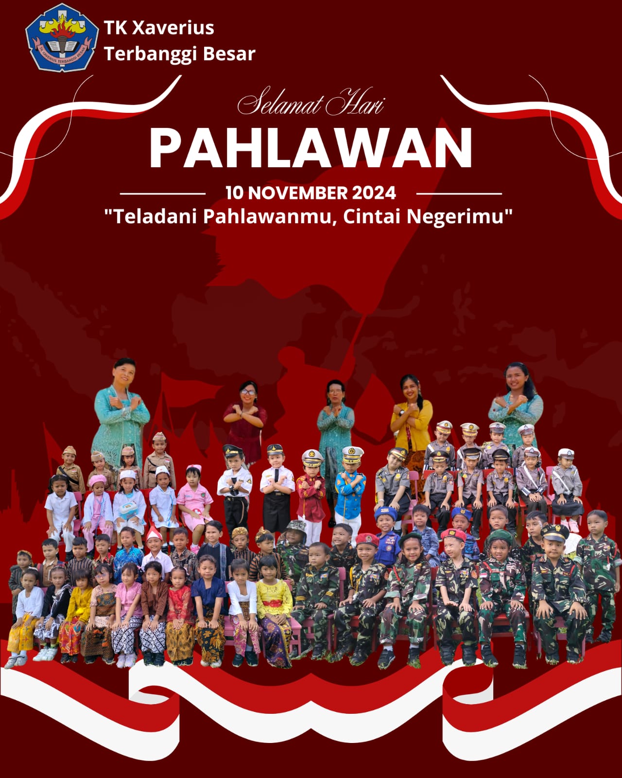 Tk Xaverius Terbanggi Besar memperingati hari Pahlawan yang jatuh pada tanggal 10 November 2024 . Namun karena hari tersebut adalah hari minggu, maka hari Pahlawan diperingati pada hari Senin, tanggal 12 November 2024 dengan diikuti oleh seluruh peserta didik TK A dan B, serta semua guru dan karyawan TK Xaverius Terbanggi Besar dengan mengenakan pakaian pahlawan atau baju adat. Dalam rangka memperingati Hari Pahlawan yang jatuh pada tanggal 10 November, TK Xaverius Terbanggi Besar menggelar serangkaian kegiatan yang penuh makna dan edukatif. Kegiatan dimulai dengan upacara bendera yang diikuti oleh seluruh guru dan peserta didik sebagai bentuk penghormatan kepada jasa para pahlawan yang telah berjuang demi kemerdekaan Indonesia.